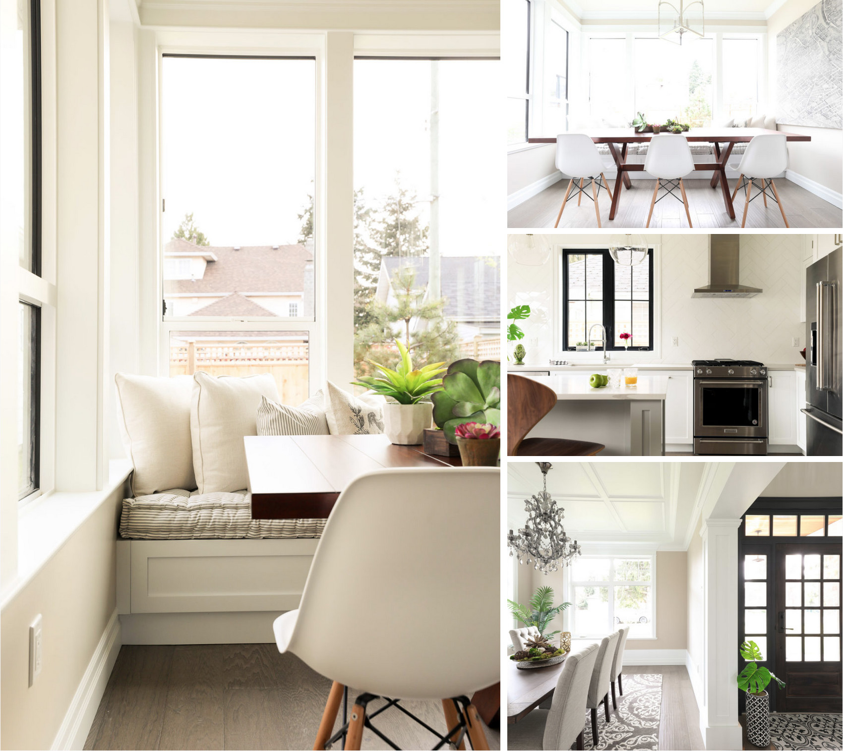 WITH EARLY MORNINGS in mind, the kitchen faces east to gather sunshine while the breakfast nook’s built-in seating looks onto the backyard. Custom-made striped French linen cushions soften the window seat.