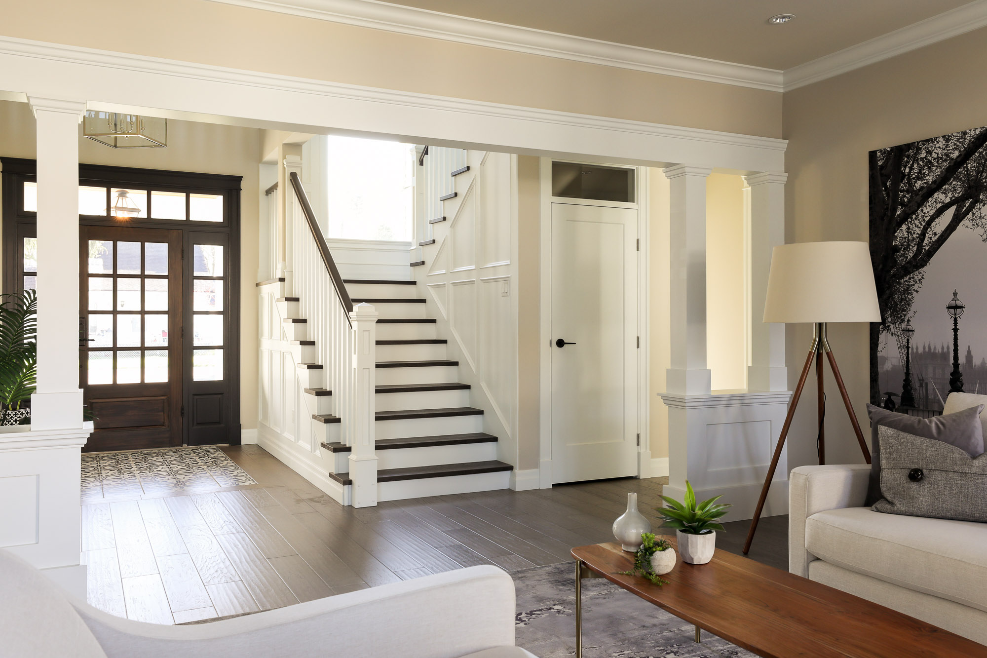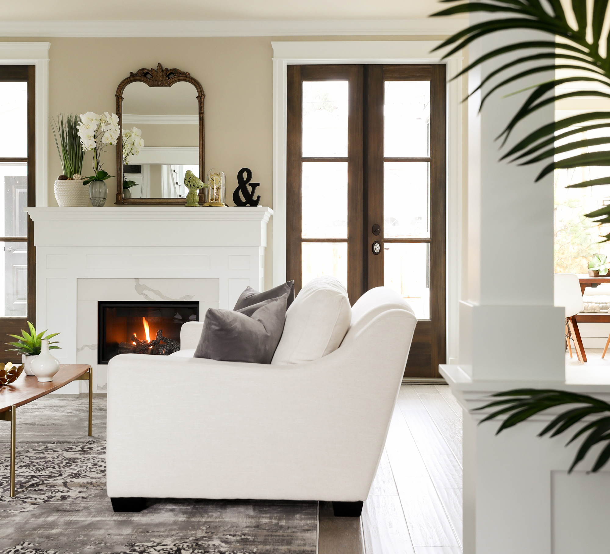 ON THE GROUND FLOOR, a generous staircase greets guests with a happy, sunlit window seat — imagined as a perch for the family pet or a little spot to curl up with a book and watch the street below. A wide Arts & Crafts inspired archway invites the gaze through the foyer to the Family Room with its fireside French doors, and beyond to the grassy backyard.