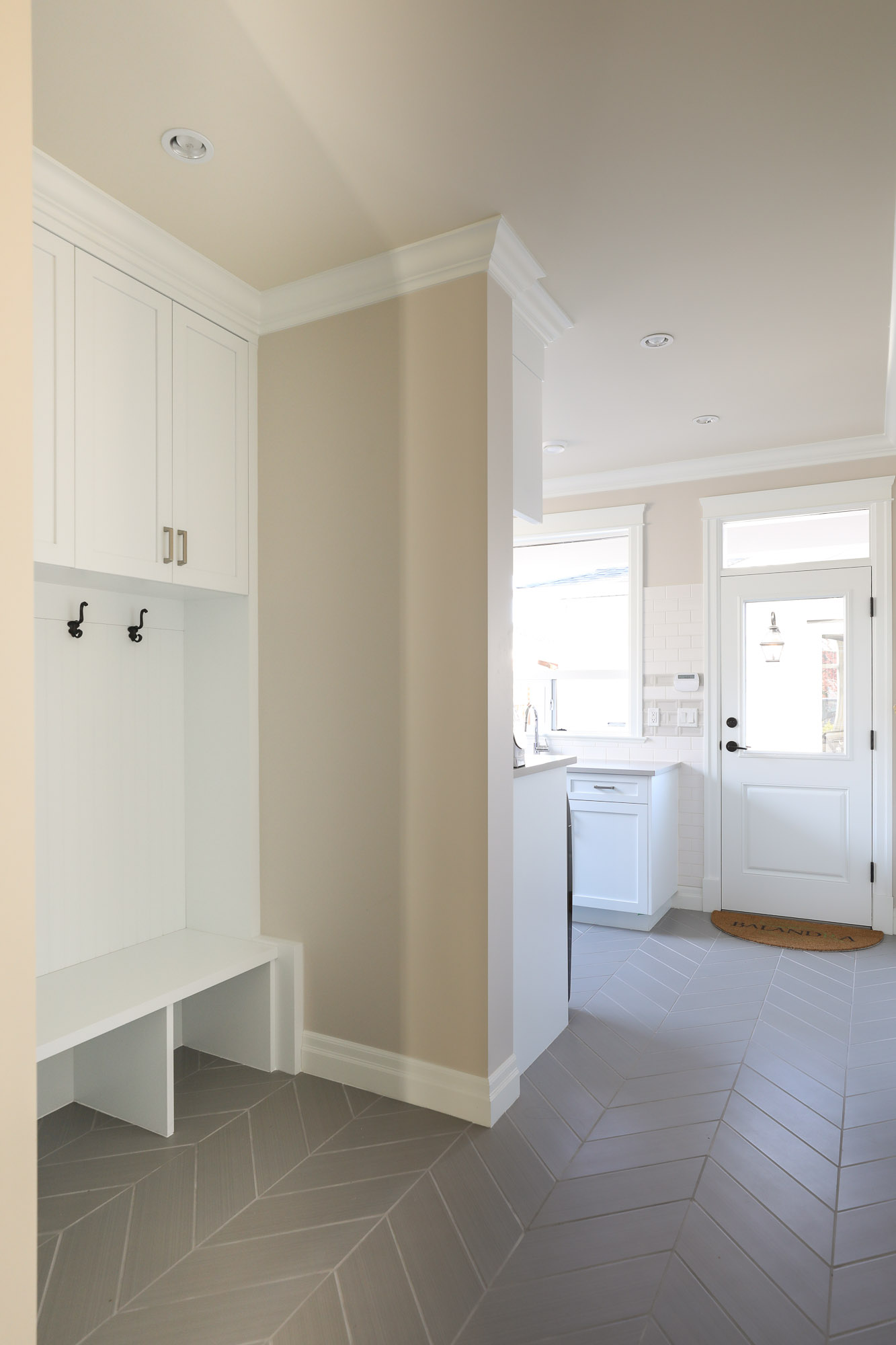 wheelchair. The Home Studio opens directly to a covered back porch. Side by side laundry is coupled with lengthy counterspace for housekeeping, all with a view to the yard. Built-in coat cubbies maintain order while still being easy to access. The chevron tile pattern over radiant in-floor heating coaxes off boots more easily in winter months. A quiet corner is reserved for the family pet crate.